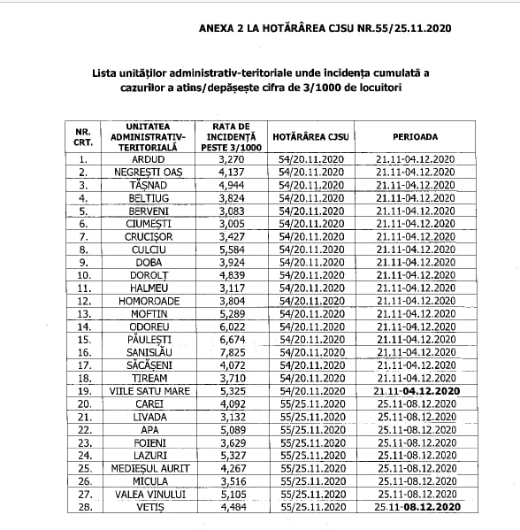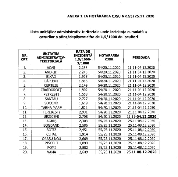 Astfel: Art.1. Se aprobă lista unităților administrativ-teritoriale în care se aplică măsurile prevăzute în legislație de specialitate acolo unde rata de incidență a cazurilor de COVID-19 la 1000 de locuitori se încadrează între limitele 1,5 și 3, conform anexei nr.1 care face parte integrantă din prezenta hotărâre.