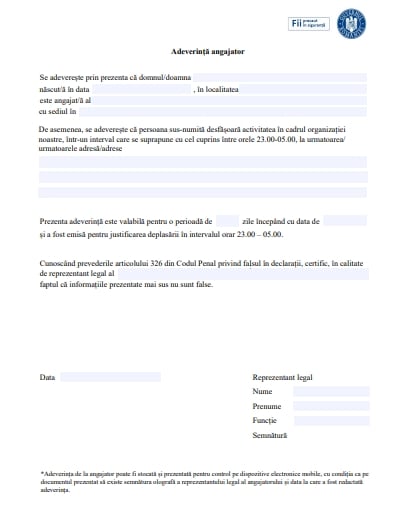 Modelul declarației pe propria răspundere pentru deplasarea în afara locuinței în intervalul orar 23.00-05.00 și modelul adeverinței de la angajator pot fi descărcate de pe site-ul stirioficiale.ro, accesând link-urile de mai jos.