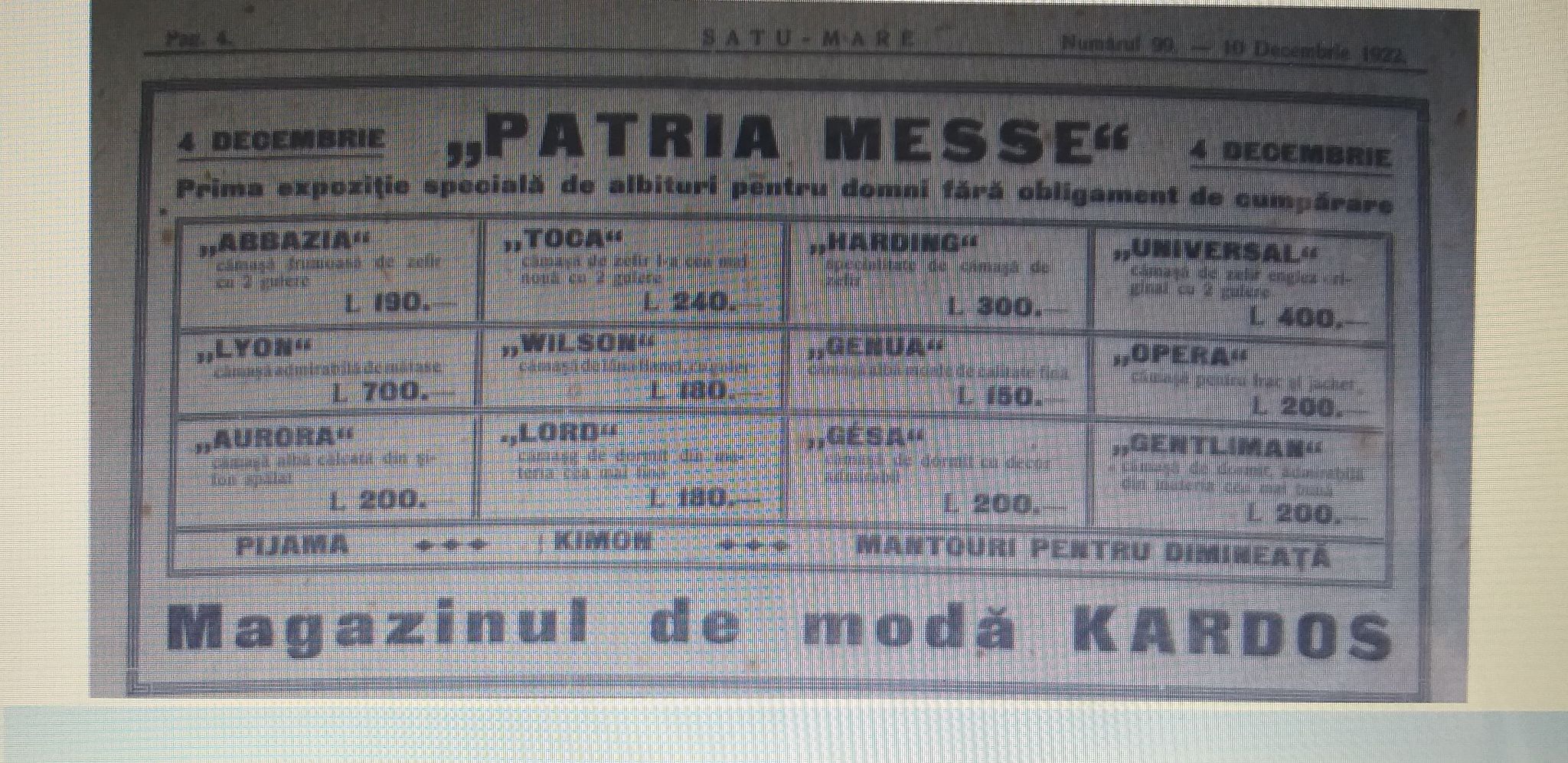 Magazinele celebre în epocă aveau reclamele cele mai atent realizate. Marea majoritate a magazinelor promovate sunt cele de haine și îmbrăcăminte. În cadrul acestei categorii, merită amintite numele câtorva magazine foarte cunoscute în epocă: magazinul Müller oferea „paltoane de iarnă pentru dame, cele mai noi modele de Viena și paltoane de piele pentru bărbați, magazinul Sámuel vindea în anul 1922, 3m de „stofă veritabilă engleză” la doar 400 de lei pentru „oficianții legitimați”, la magazinele Bela Spitz sau Mauritiu Szántó& Co se găseau de asemenea paltoane de iarnă, Katz și Weisz era un magazin de manufactură, „cu prețurile reduse ca niciodată până acum.’’