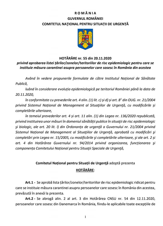 Comitetul Național pentru Situații de Urgență a adoptat în ședința de astăzi, 20 noiembrie 2020, Hotărârea numărul 55.