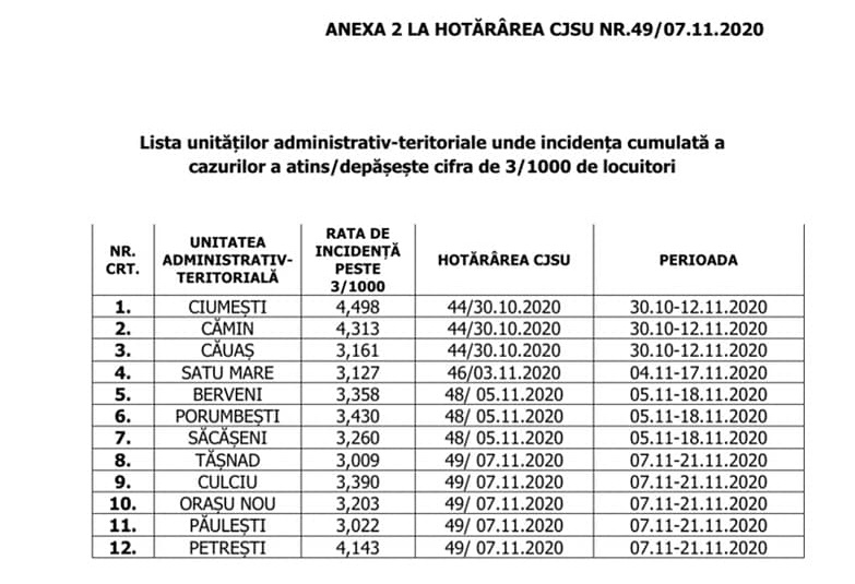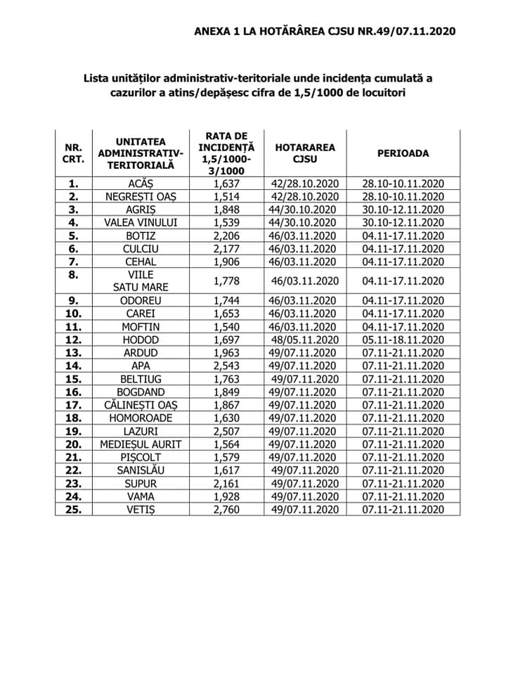 Comitetul Județean pentru Situații de Urgență Satu Mare a adoptat Hotărârea nr.49 privind completarea Hotărârii CJSU nr.46/03.11.2020 cu privire la stabilirea şi aprobarea măsurilor care se aplică la nivelul judeţului Satu Mare pentru prevenirea şi combaterea infecțiilor generate de COVID-19.Astfel: