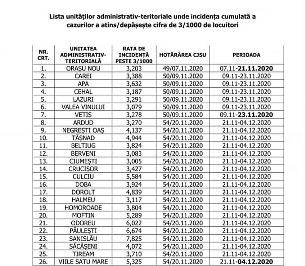 Art.2. Se aprobă lista unităților administrativ-teritoriale în care se aplică măsurile prevăzute în legislație de specialitate acolo unde rata de incidență a cazurilor de COVID-19 la 1000 de locuitori depășește limita de 3, conform anexei nr.2 care face parte integrantă din prezenta hotărâre.