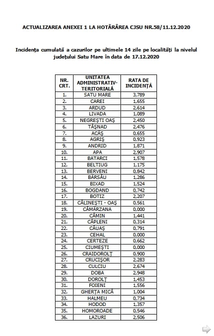 Incidența cumulată a cazurilor pe ultimele 14 zile pe localități la nivelul județului Satu Mare în data de 17.12.2020