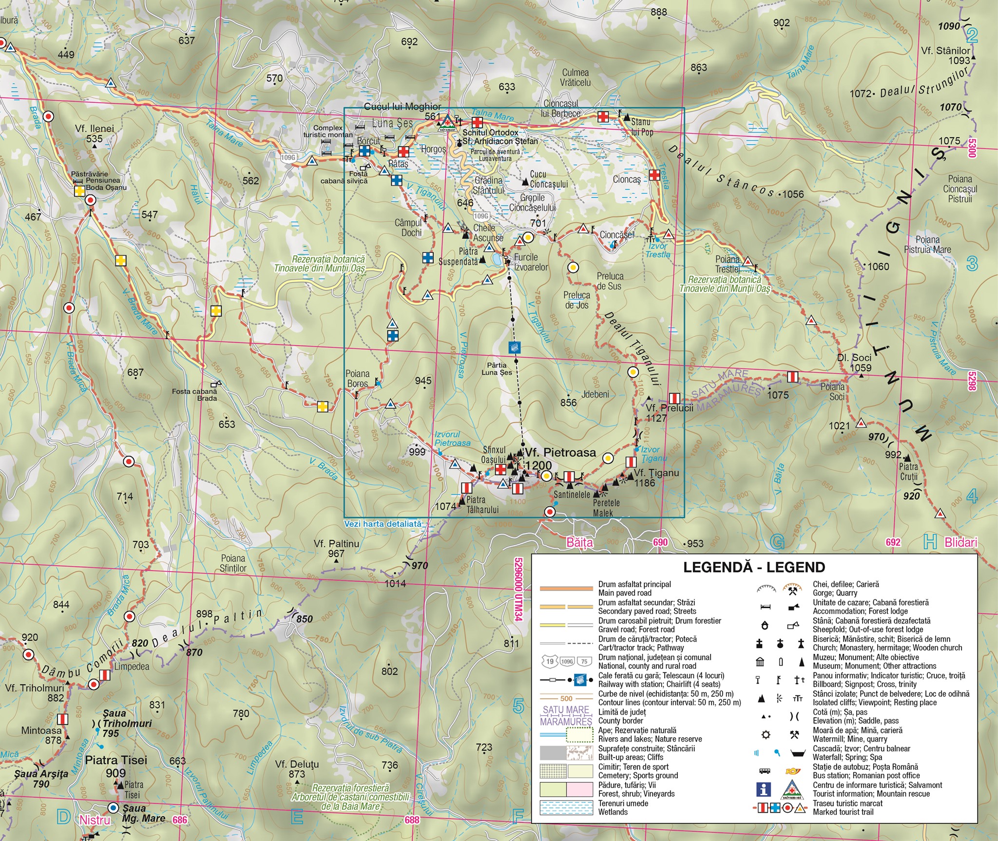Scurtă descriere: Odată ajunși în parcarea de la baza pârtiei Luna Șes, după verificarea echipamentului, ne pornim la drum urmând traseul Triunghi Roșu al cărui punct final va fi Poiana Soci, parcurs în aproximativ 2 ore. Traseul care în prima parte este comun cu traseul Punct Galben, ne conduce prin incinta Telescaun Luna Șes, după care începe să urce prin pădure până la marginea unei fânețe, de unde vom avea o frumoasă panoramă asupra microdepresiunii Luna Șes, locul fiind marcat pe hartă cu denumirea „Copacul singuratic”. În continuare după o scurtă pantă accentuată cele două marcaje se despart, noi urmând Triunghiul Roșu către stânga, ce ne va conduce pe curbă de nivel până în Poiana Cioncășel, un loc deschis cu o frumoasă panoramă, unde vom găsi și un izvor cu apă de cristal. De aici continuăm traseul prin pădurea de brazi către Izvorul Trestia, loc de joncțiune cu Cruce Roșie care urcă până aici, pornind de la Borcut Luna Șes. Urmând traseul vom trece pe lângă Rezervația naturală Tinov Trestia la al cărei capăt vom găsi o rampă de încărcat bușteni, de unde ne vom încadra direct pe firul văii Trestia. Deplasarea pe vale necesită puțină atenție la deplasarea pe poteca îngustă (cca 200 m) după care o cotește stânga pe un vechi terasament ce urmează curba de nivel printr-o pădure seculară de molid. După ieșirea din pădure vom găsi un loc deschis în care se întâlnesc trei văi , de unde ne vom continua urcarea, destul de accentuată pe piciorul din stânga, care ne va conduce până în Poiana Soci, care este și punctual final al traseului Triunghi Roșu. Poiana Soci este un punct important, de aici putându-se ajunge către:1- Vf. Țiganu-Peretele Malek-Vf. Pietroasa, traseu Bandă Roșie omologat SPJ Salvamont SM. 2- localitatea Blidari, Maramureș pe traseu marcat Triunghi Roșu, dar care pe anumite porțiuni ridică probleme de orientare. 3- Vârful Rotundu, traseu neomologat, în curs de amenajare SPJ Salvamont SM. În continuare vom urma traseul Bandă Roșie care ne va conduce pe linia de creastă către Izvorul Țiganu (cca 40 min), de unde după un urcuș pe o pantă accentuată vom ajunge pe vârful Țiganu cu al său loc de belvedere. De aici vom avea o frumoasă panoramă către munții Maramureșului, Rodnei și Gutâi. Continuându-ne traseul vom atinge un alt punct de panoramă, situat deasupra Peretelui Malek, de unde vom putea admira catre sud, depresiunea Băii Mari, Defileul Someșului și zona Codru. După un respiro, poteca marcată cu Bandă Roșie ne va conduce prin Șaua Pietroasa, până în punctul cel mai înalt al circuitului, și anume în vârful Pietroasa 1200m.