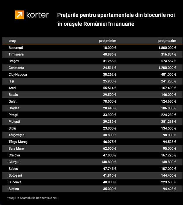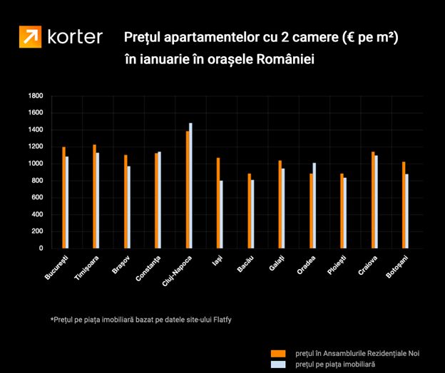 Primele trei zone sunt și principalii piloni ai pieței imobiliare din România. București și Ilfov atrag cele mai multe investiții imobiliare, în timp ce Cluj înregistrează cea mai mare medie a prețurilor/mp din țară. Surprinzător este că în topul prețurilor, conform analizei Korter efectuată pe baza anunțurilor listate, Timișoara a luat fața capitalei în luna ianuarie 2021. Astfel, media prețurilor din Timișoara este de 1.155 euro/mp în cazul apartamentelor situate în ansambluri rezidențiale noi, respectiv 1.180 pentru cele din blocuri vechi. Prețurile din București și împrejurimi sunt de 1.021 euro/mp la apartamentele noi și 1.072 pentru locuințele din blocuri vechi.