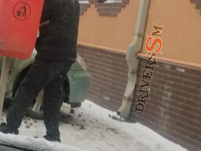 “ Botizului cu 9 Mai. Impact intre 2 autoturisme. În poze apare doar una dintre mașini, cea care lipsește era lovită în față. Mașina din poze a urcat pe trotuar lovind burlanul casei. În zonă nu era așa alunecos cum ar crede unii, mai ales că în apropiere este și un sens giratoriu care te obligă să încetinești. Nu știm cine este vinovatul,” au relatat cei de la Drivers.SM.