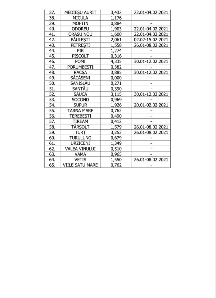 Numărul comunelor aflate sub cod roșu s-a dublat Recent a fost actualizată Anexa la Hotărârea CJSU nr. 3 din 15 ianuarie 2021 care arată ncidența cumulată a cazurilor pe ultimele 14 zile pe localități la nivelul județului Satu Mare în data de 01.02.2021.