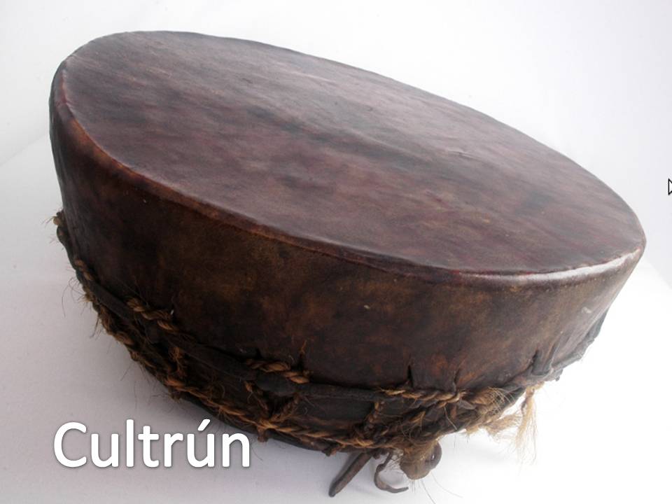 Cultrún – ”este un membranofon, cu membrană atașată, lovit direct, emisferic ( ca timpanul ), fiind un instrument independent, care măsoară aproximativ 35 - 40 cm în diametru și o înălțime de 12 - 15 cm, corpul său fiind alcătuit din lemn de scorțișoară , de laur , lenga sau lingue, tăiat în timpul iernii, astfel încât fibra lemnului să nu se destrame. Este construit prin miezul trunchiului dându-se plăcii de sunet forma unui con deschis sau concav, ulterior, atașându-se o bucată de piele de miel sau de cal care acoperă gura, tensionată cu legăturile din piele care acoperă corpul tamburului.