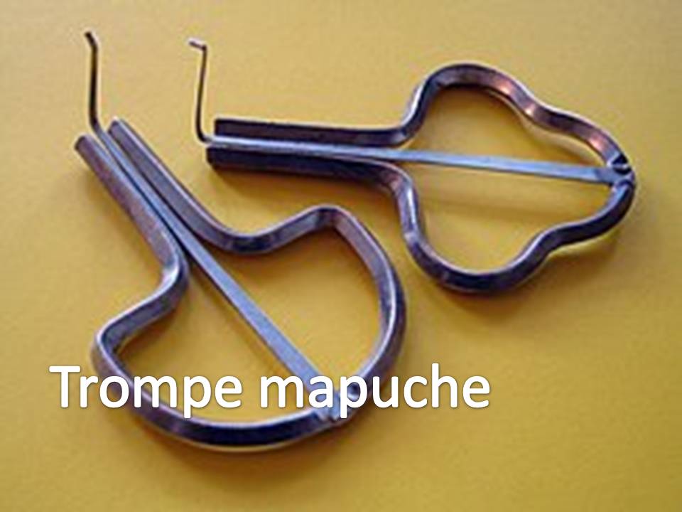 Trompe Mapusche ... acest instrument muzical neobișnuit, provine de fapt din Argentina și face parte integrantă din cultura indigenă Mapuche. ”În timp ce populația Mapuche a rezistat cu succes colonizării spaniole timp de peste trei secole, ei au fost fascinați de ”Harpa de jawă” - Harfa de gură - pe care spaniolii a adus-o probabil cu ei. Este un instrument muzical idiofonic mic și destul de simplu, fiind alcătuit dintr-o arcadă metalică - în Asia de Sud-Est acest arc sau armură este de obicei făcut din bambus - cu o limbă de oțel în mijloc, forma întregului instrument reamintind de litera grecească φ . De obicei, cavitatea este ținută cu gura de muzician, cavitatea orală acționând ca o placă de sunet.