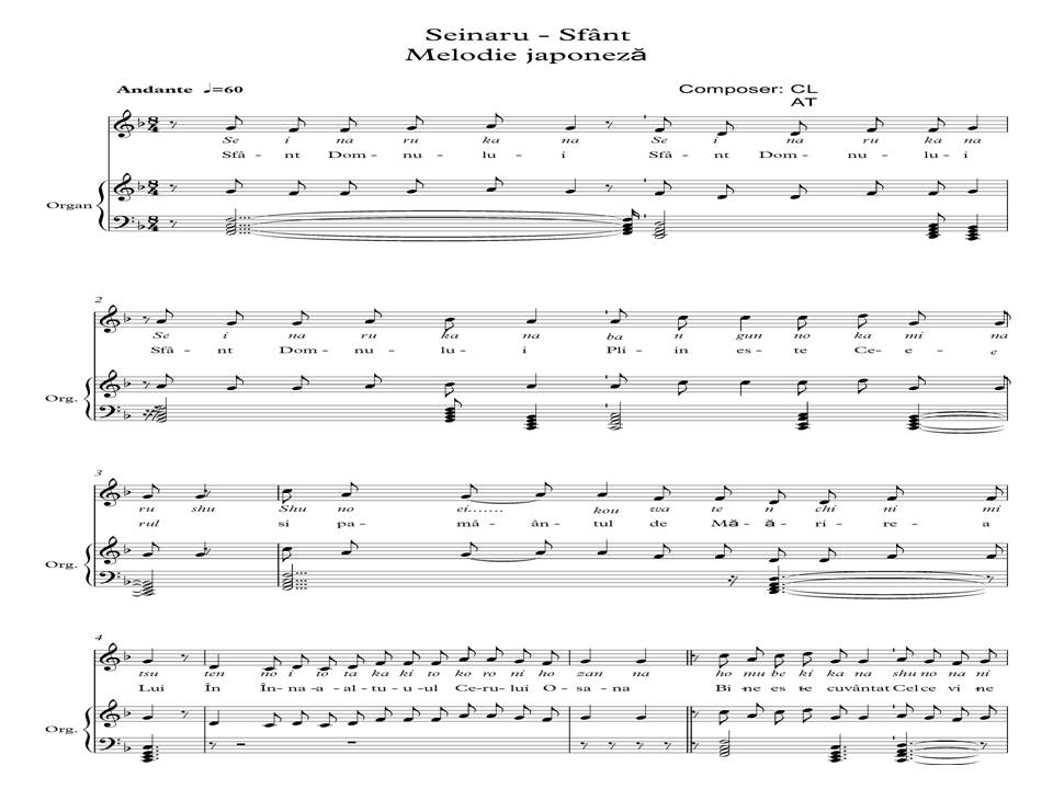 O să vă prezint în continuare, o lucrare japoneză religioasă în exclusivitate mondială, un produs al școlii componistice – muzicologice sătmărene, lucrare numită ”SEINARUKANA – SFÂNT ESTE DOMNUL”, poate fi interpretată ”a capella” (fără orchestrație) sau cu acompaniament de orgă.