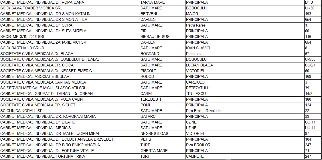 Casa de Asigurări de Sănătate Satu Mare a încheiat contracte cu 54 cabinete medicale de familie din județ in vederea administrării vaccinului împotriva Covid-19. În materialul de mai jos prezentăm lista integrală a acestor cabinete, unul dintre aceastea fiind și al doctorului Dorel Coica.