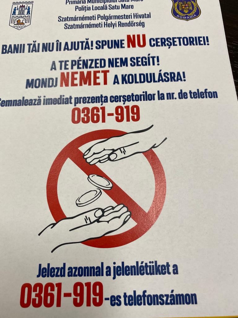 De asemenea, Poliția Locală a început o amplă campanie de combatere a cerșetoriei, urmând să se pună în fiecare local afișe de descurajare a fenomenului, oamenii fiind îndemnați să nu ofere bani.