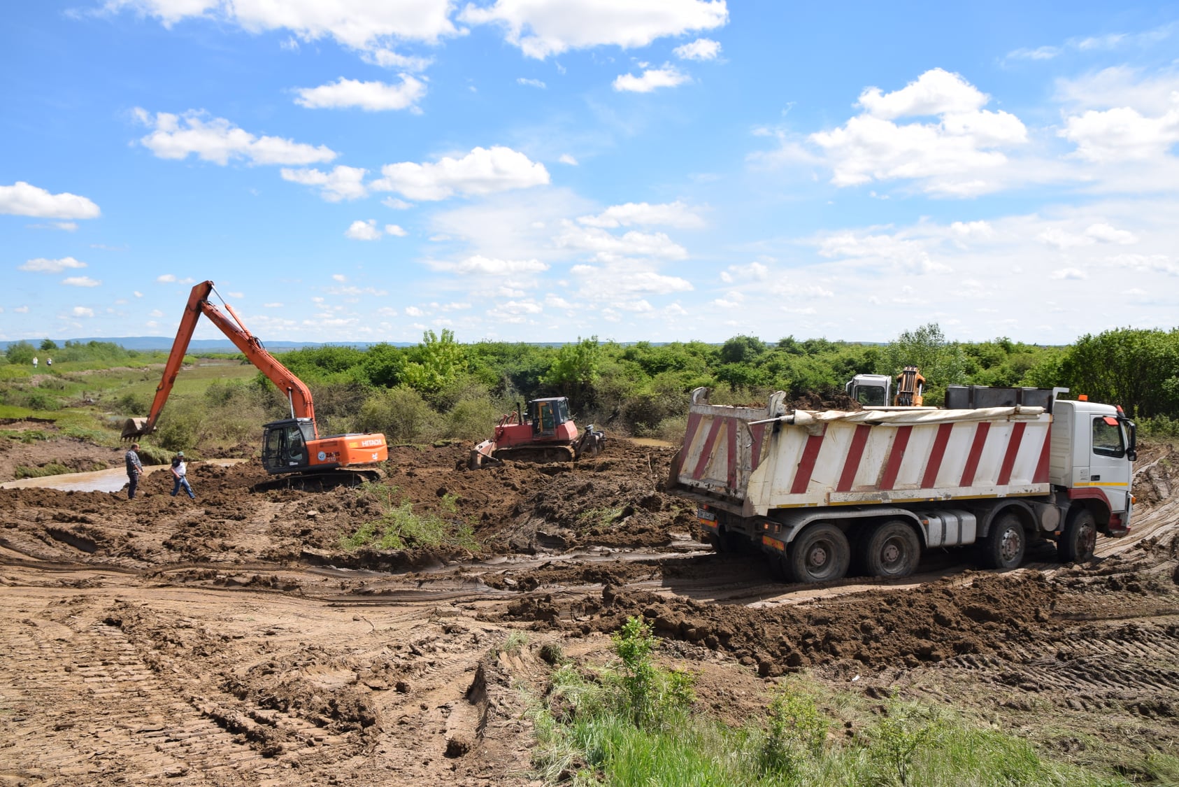 La momentul respectiv, aici se intervenea cu patru utilaje (dou[ excavatoare, un buldozer, un autocamion), lucrările fiind în etapa a doua, respectiv de realizare a umpluturilor de pământ, după ce porțiunea de dig a fost pusă în siguranță în regim de urgență cu big-bags și saci cu nisip.