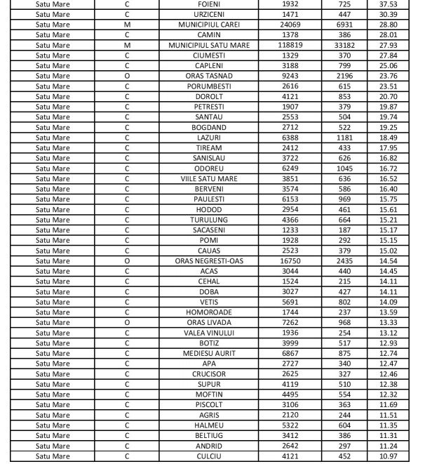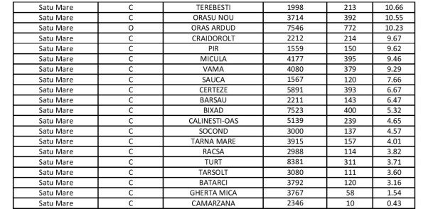 Pe primele două poziţii se situează comunele Foieni (37,53%) şi Urziceni (30,39%), locul trei fiind ocupat de municipiul Carei, cu un procent de 28,80%.