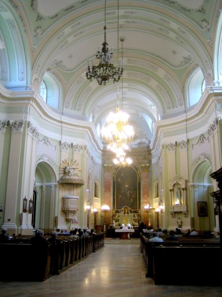 Altarele şi construcţiile altarelor se încadrează organic în acest mediu. Corul este dominat de monumentalul altar principal, iar în cele şase capele adâncite în zidurile navei se află câte un altar lateral: pe partea nordică altarul închinat Sfântului Anton de Padova, Sfântului Iosif, Sfântului Andrei de Avellino, iar pe partea sudică altarul Sfântului Ioan Nepomuk, Sfintei Treimi, şi Sfinţilor Regi Maghiari. Picturile altarelor au fost realizate între 1778-1780 de Johann Ignaz Cimbal, unul dintre cei mai importanţi reprezentanţi ai picturii baroce central-europene din secolului al XVIII-lea, un pictor de origine sileziană care a excelat mai ales în pictura unor altare şi cea murală. Cele şapte altare baroce au un rol dominant în decorul interiorului bisericii.