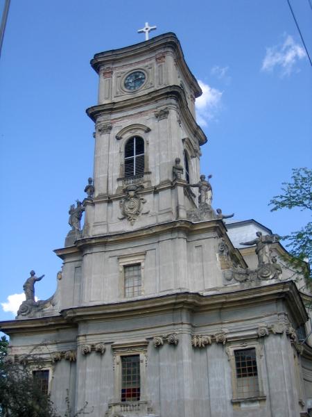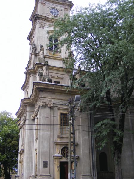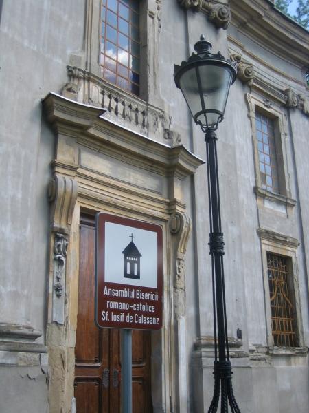 Fosta mănăstire piaristă, în care astăzi funcţionează parohia bisericii, era formată iniţial din patru aripi, dispuse în jurul unei curţi interioare. Astăzi numai aripa sudică şi nordică s-au păstrat în forma lor originală. Intrarea principală în mănăstire se află în axul central al laturii sudice cu 9 axe, printr-o uşă cu închidere semicirculară flancată de două lesene vopsite portocaliu, ieşite uşor din linia pereţilor şi decorate pe partea lor superioară cu o volută.