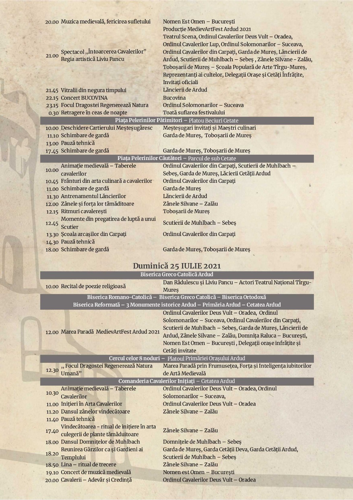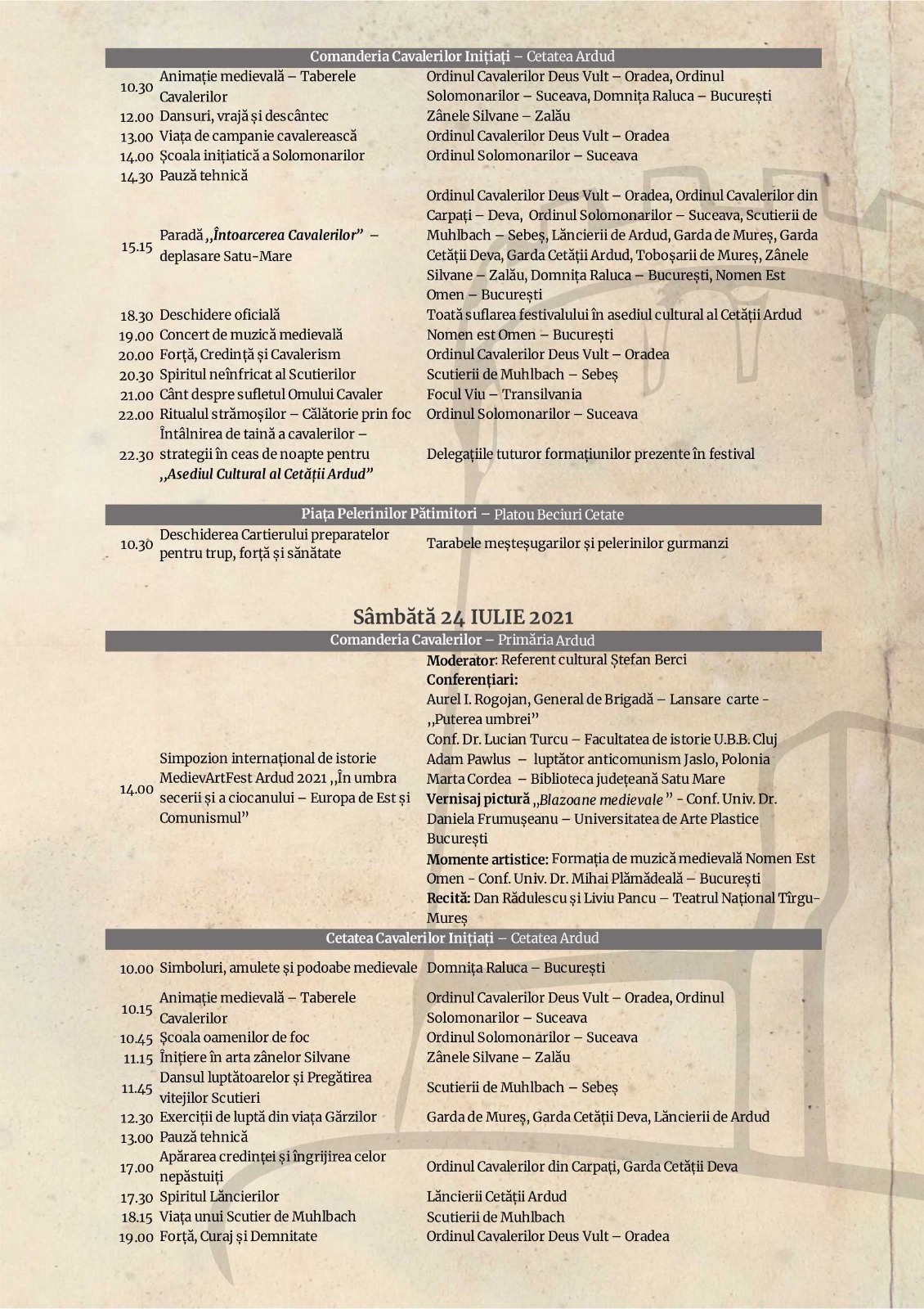 Pe parcursul a trei zile, participanții se bucură de muzică și dansuri medievale, ordine militare de reconstituire medievală, teatru medieval, conferințe și expoziții.
