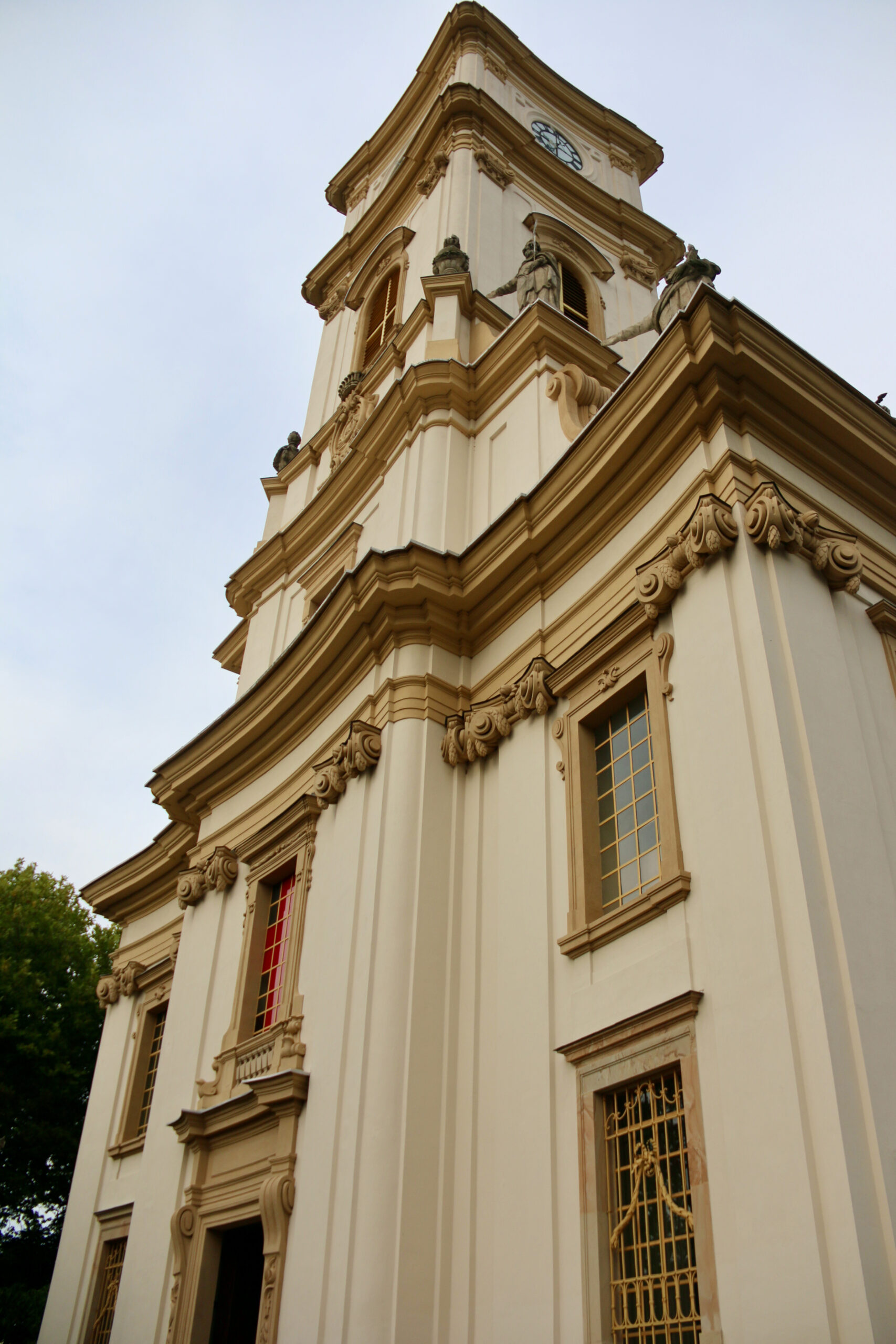 Nivelul inferior al fațadei este închis cu o bordură bogat profilată. Asupra acestui nivel se ridică turnul structurat orizontal, ornamentat cu elemente arcuite, volute, urne, statui, ferestre și bordurile orizontale, care structurează turnul pe trei niveluri.