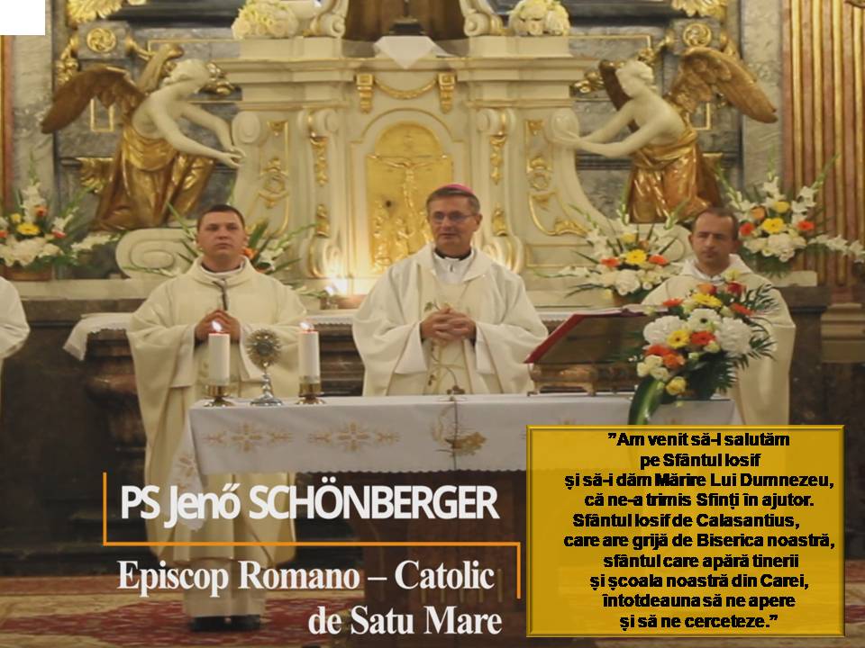 La fiecare Sfântă Liturghie, să-i mulțumim Lui Dumnezeu. Totodată să-i cerem ajutorul Lui Dumnezeu să-i apere pe tinerii noștri, pe copii, pe credincioșii parohiei noastre, Ordinul Piarist și pe surorile Piariste; să le trimită chemări și astfel de oameni care să-i urmeze modelul lui Iosif de Calasantis cu suflet, cu credință și cu dragoste. (PS Jenő SCHÖNBERGER, Episcop Romano – Catolic de Satu Mare).