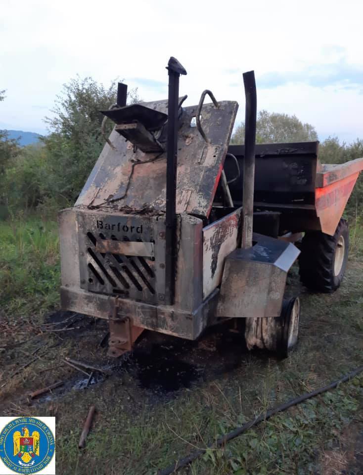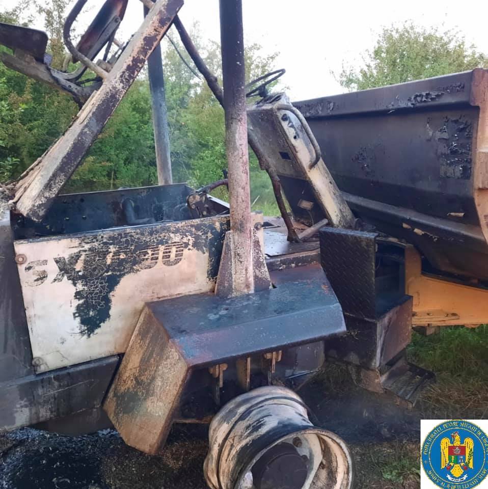 Au ars compartimentul motor și 2 anvelope și s-a degradat puntea din spate a utilajului.