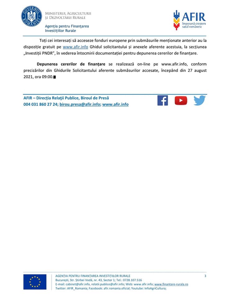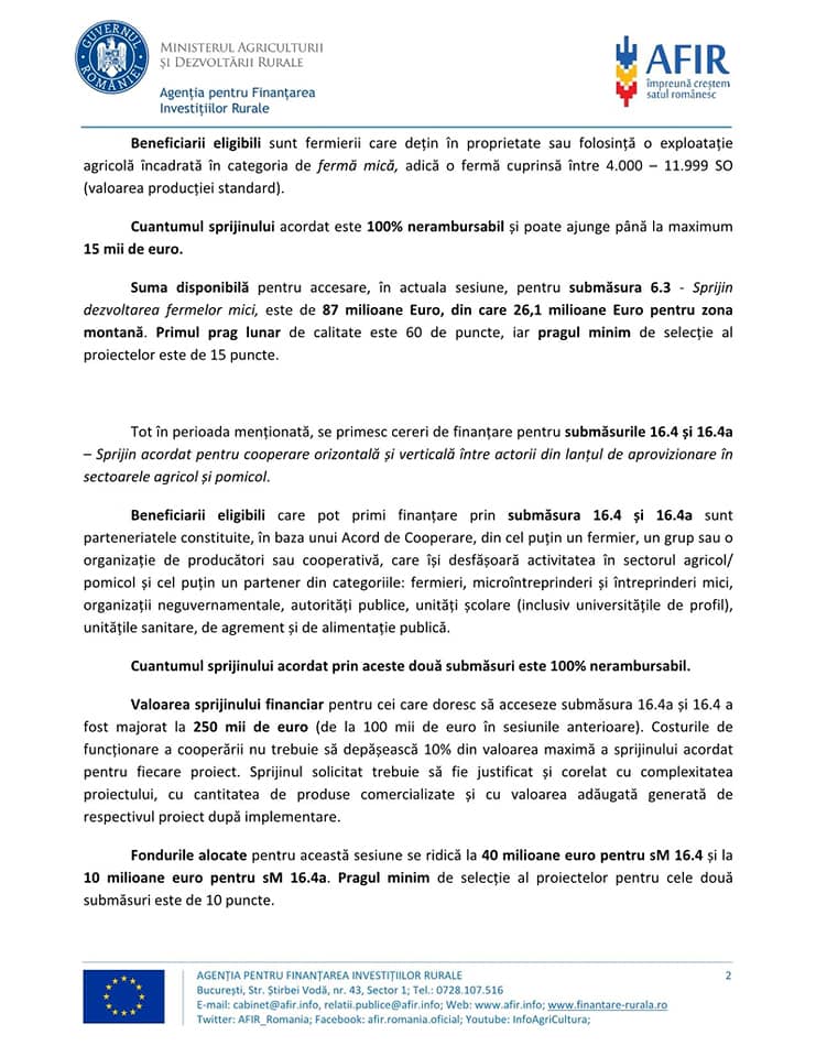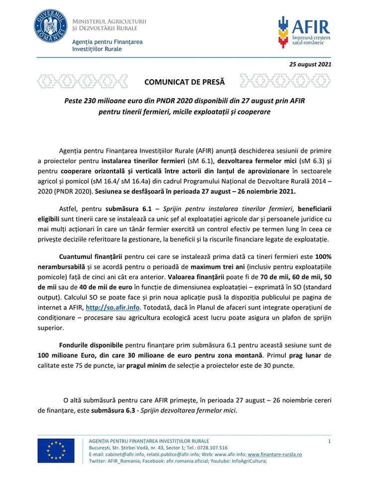 Agenția pentru Finanțarea Investițiilor Rurale deschide începând cu data de 27 august 2021 sesiunea de primire a proiectelor pentru instalarea tinerilor fermieri (sM 6.1), dezvoltarea fermelor mici (sM 6.3) și pentru cooperare orizontală și verticală între actorii din lanțul de aprovizionare în sectoarele agricol și pomicol (sM 16.4/ sM 16.4a) din cadrul Programului Național de Dezvoltare Rurală 2014 – 2020 (PNDR 2020).