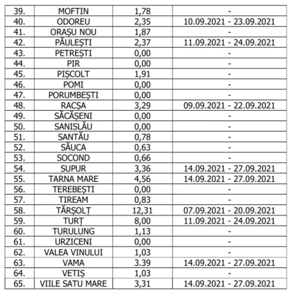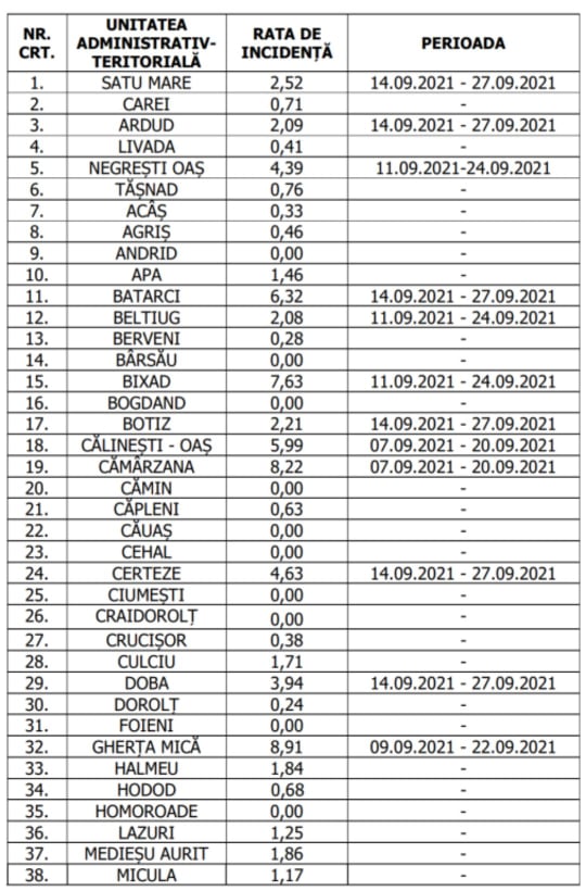 A fost publicata Anexa cu incidența actualizată la data de 13.09.2021, în baza căreia se pun în aplicare măsurile specifice prevăzute de Hotărârea C.J.S.U. nr. 42 din 09.09.2021 privind stabilirea şi aprobarea măsurilor care se aplică la nivelul judeţului Satu Mare pentru prevenirea şi combaterea infecțiilor generate de noul Coronavirus.