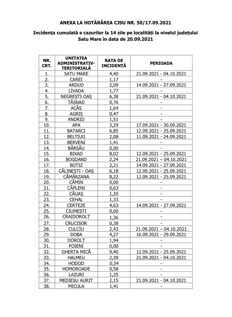 Potrivit Comitetului Județean pentru Situații de Urgență, lider detaşat în ceea ce priveşte incidenţa COVID în judeţ este comuna Târşolţ - 13,57 la mie, urmat de Gherţa Mică - 9,4 la mie, Camârzana - 8,22 la mie.