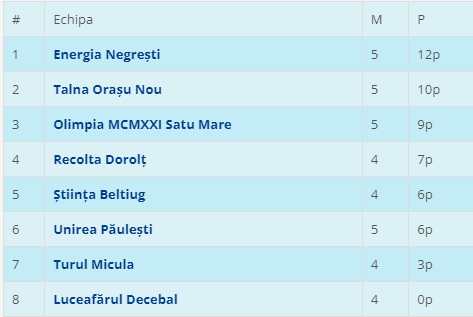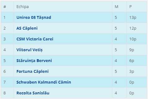 În seria B, Unirea Tășnad s-a impus cu 7-1 în partida cu Schwaben Cămin și a rămas pe prima poziție.