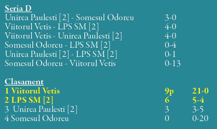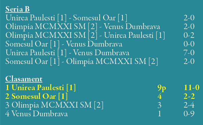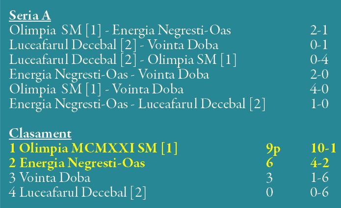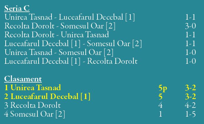 În Seria C, Tăşnad şi Decebal şi-au jucat prima poziţie la lovituri de departajare (egalitate perfectă).