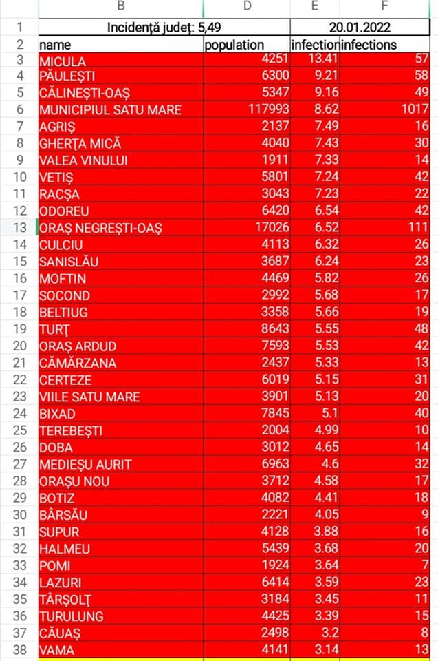 Incidenta îmbolnăvirilor de Covid-19 la data de 20.01.2022 în județul Satu Mare