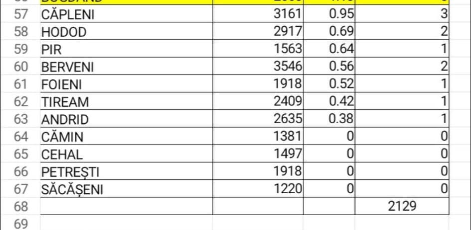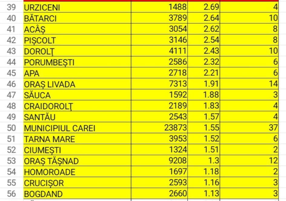 Cu o incidență foarte mare se află comunele Micula 13,41, Păulești - 9,21 și Călinești-Oaș - 9,16 cazuri noi la mia de locuitori.