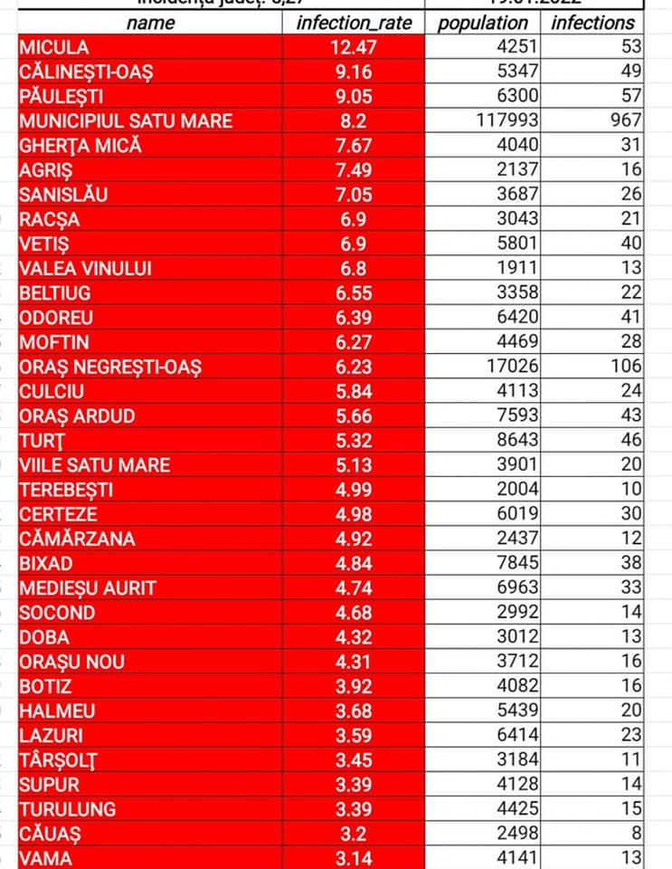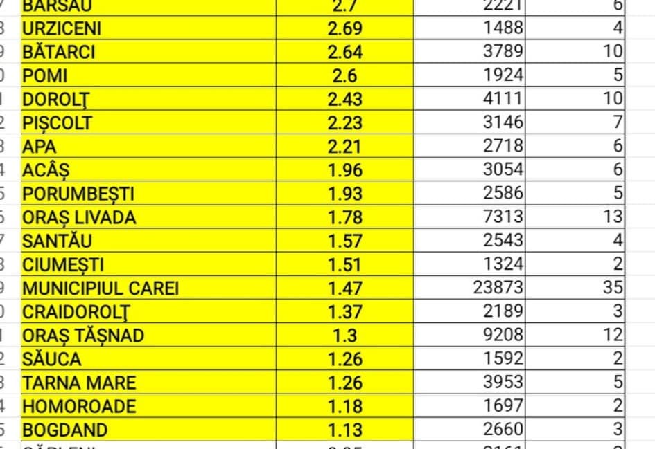 În scenariul roșu se mai află și orașul Negrești Oaș, cu o incidență de 6,23 la mie (la o populație de 17.026 locuitori fiind înregistrate 106 infectări), precum și orașul Ardud, cu o incidență de 5,66 la mie ( la o populație de 7592 locuitori fiind înregistrate 43 de infectări).