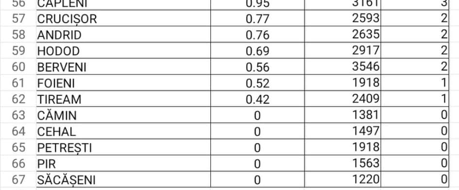 La popul opus, cu incidență ZERO, se află comunele Cămin, Cehal, Petrești, Pir și Săcășeni.
