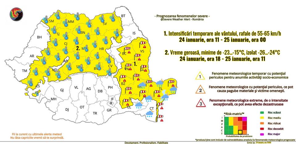 Potrivit Severe Weather Alert - România, din deta de 24 ianuarie, ora 18 -până în data de 25 ianuarie, ora 11, nordul, centrul și nord-estul țării se află sub cod galben de ger.