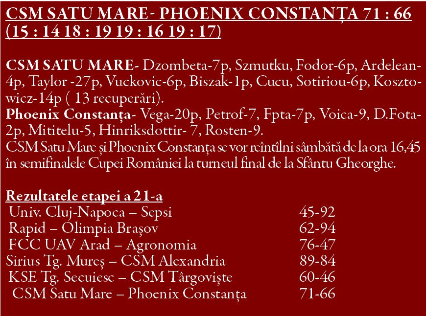 CSM Satu Mare s-a desprins la 63-55 cu patru minute înaintea finalului , oaspetele au revenit la 66-63 dar n-au mai găsit resurse de egalare iar cu emoții , până la urmă, fetele lui Lopez au câștigat , scor 71-66.