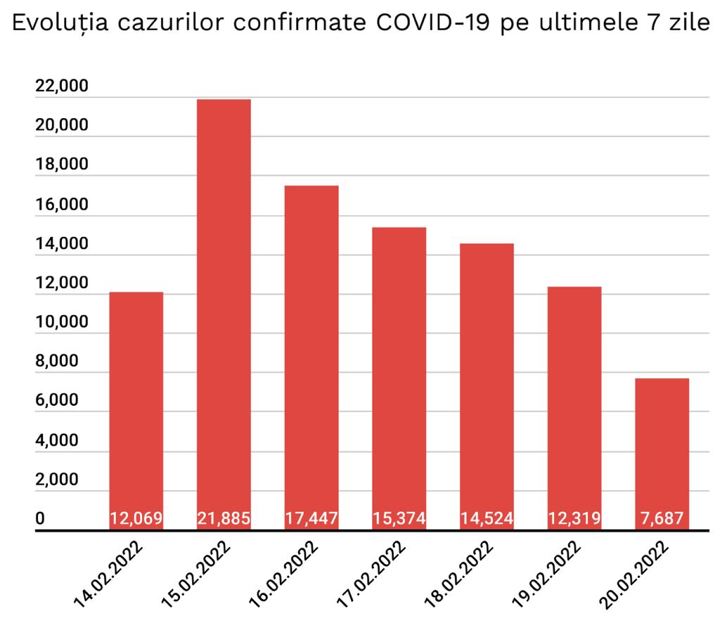 În ultimele 24 de ore au fost înregistrate 7.687 cazuri noi de persoane infectate cu SARS – CoV – 2 (COVID – 19), cu 4.632 mai puțin decât în ziua anterioară. 851 dintre cazurile noi din 24 de ore sunt ale unor pacienți reinfectați, testați pozitiv la o perioadă mai mare de 180 de zile după prima infectare.