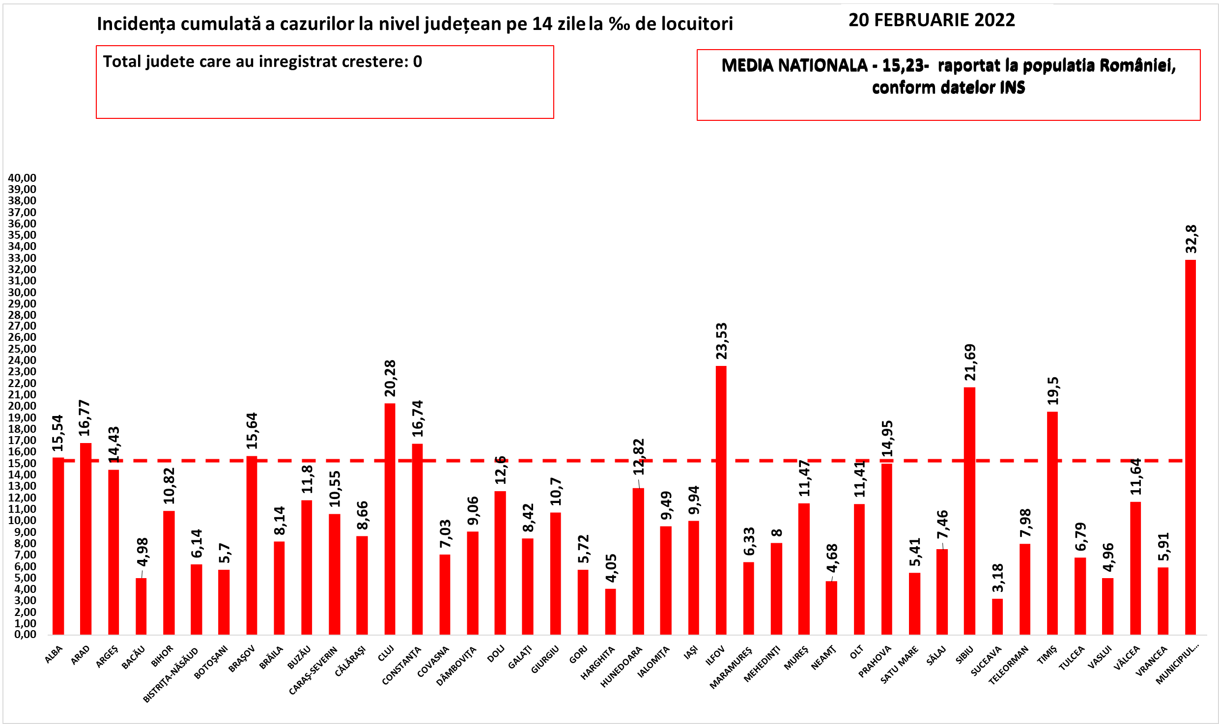 | Nr. crt. | Județ | Număr de cazuri confirmate(total) | Număr de cazuri nou confirmate | Incidența înregistrată la 14 zile |