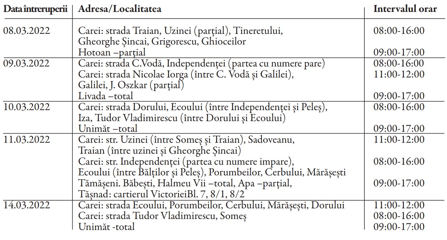 Informaţii actualizate despre întreruperile planificate și neplanificate în alimentarea cu energie electrică sunt disponibile pe site-ul www.distributie-energie.ro, rubrica Suport/Întreruperi. Ne cerem scuze pentru neplăcerile cauzate de aceste întreruperi, care sunt însă necesare pentru asigurarea unei bune funcţionări a instalaţiilor.