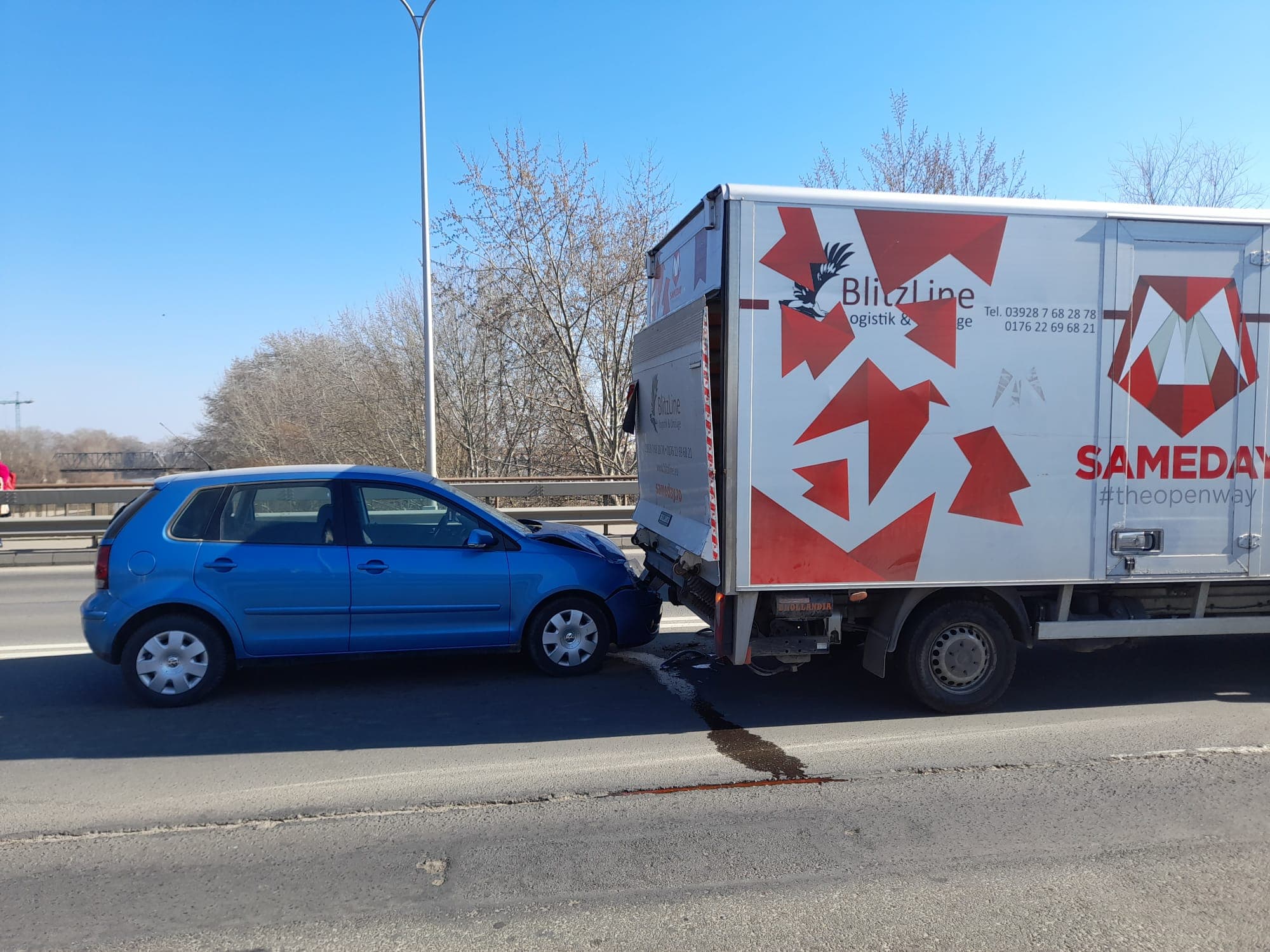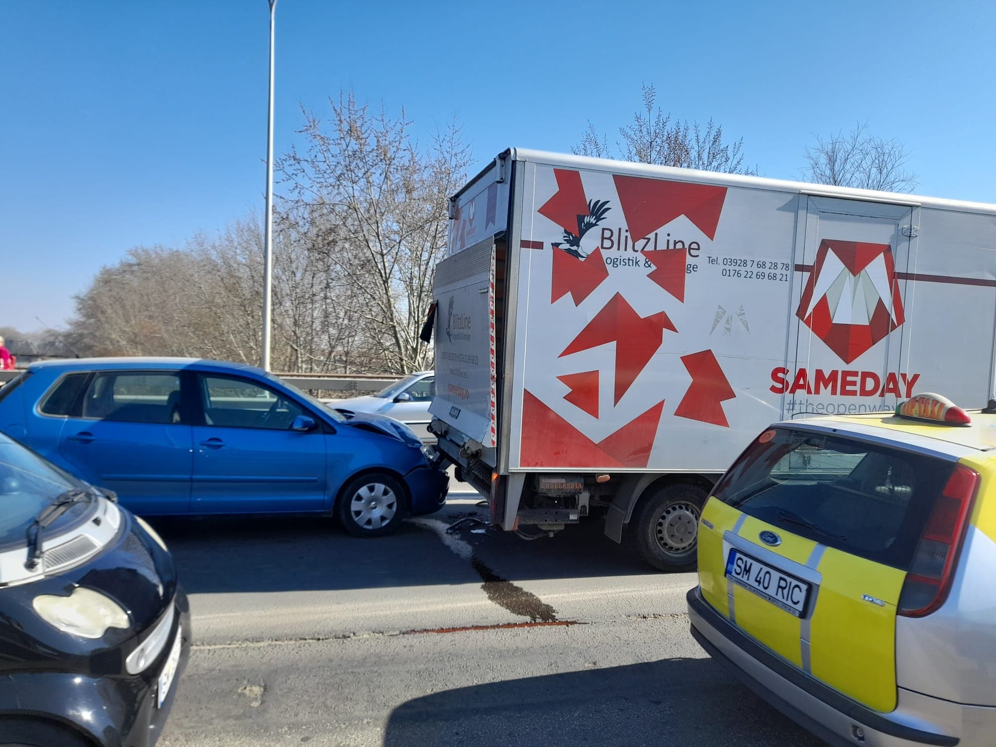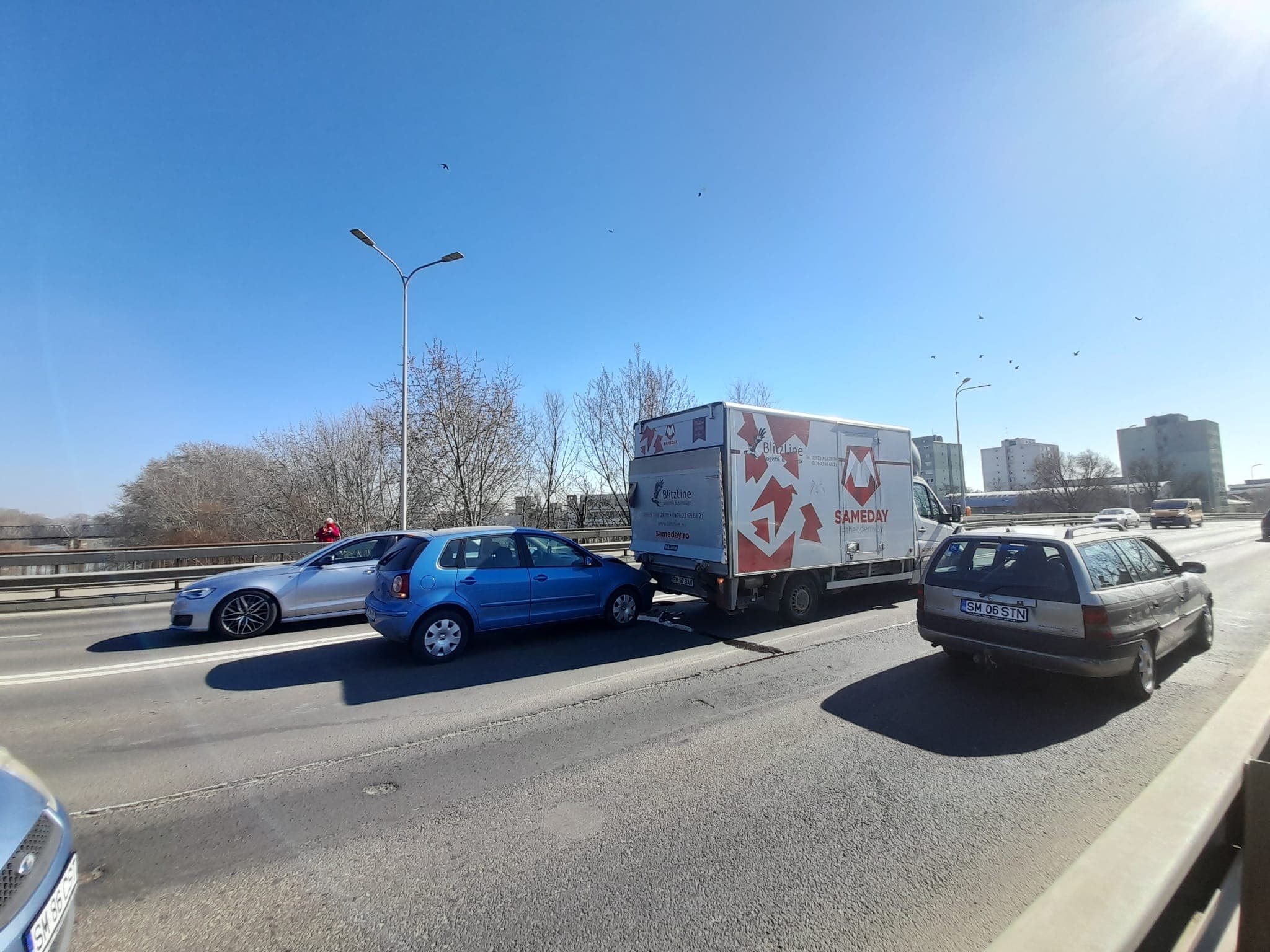 Circulația pe Podul Decebal a fost îngreunată aproape o jumătate de oră în urma unui accident. Practic, un VW Polo, la volanul căruia se afla o șoferiță de circa 30 de ani, a intrat în spatele unei dubițe a unei firme de curierat.
