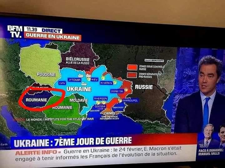 În ultimele ore ne-a fost dat să vedem cum francezii, și mă refer aici la jurnaliștii francezi de la marile posturi de televiziune din Franța, de la care ai pretenții, fac harcea-parcea geografia din partea de este a Europei. Astfel, la unul dintre posturile TV franceze în care se încerca să se arate evoluția războiului în Ucraina, numele de România era trecut atât pe harta țării, cât și pe harta Ungariei. La un alt post, România nu era nicărieri. Pe teritoriul țării noaste era trecut numele de ....Bulgaria, care nici măar nu sunt vecini cu Ucraina. În ceea ce privește primul caz, francezii au rezlvat rapid confuzia Bukarest/Budapest...