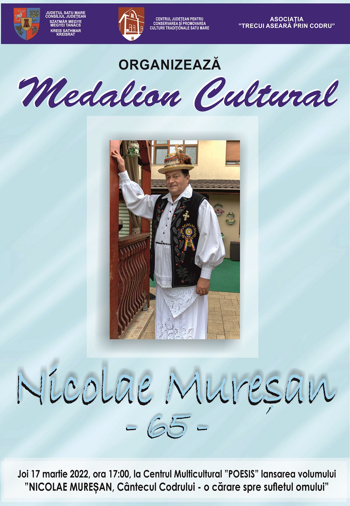În organizarea Centrului Județean pentru Conservarea și Promovarea Culturii Tradiționale Satu Mare, cu sprijinul Consiliului Județean Satu Mare și în parteneriat cu Asociația „Trecui aseară prin Codru”, joi 17 martie 2022, de la ora 17:00 la Centrul Multicultural „Poesis”, va avea loc Medalionul Cultural „Nicolae Mureșan” și lansarea volumului „Nicolae Mureșan, Cântecul Codrului – o cărare spre sufletul omului” cu prilejul împlinirii vârstei de 65 de ani.