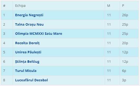 REZULTATE SERIA A etapa a 11-a Ştiinţa Beltiug – Turul Micula 5-1 Energia Negreşti Oaş – Talna Oraşu Nou 3-0 Olimpia MCMXXI SM – Recolta Dorolţ 5- 0 Luceafărul Decebal – Unirea Păuleşti 5-1