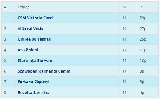 REZULTATE SERIA B – Etapa a 11-a Viitorul Vetiş – Schwaben K. Cămin 6-0 CSM Victoria Carei – Recolta Sanislău 12-0 AS Căpleni – Fortuna Căpleni 4-3 Stăruinţa Berveni – Unirea Tăşnad 0-3