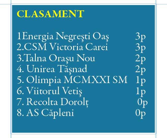 CLASAMENT 1Energia Negreşti Oaş 3p 2.CSM Victoria Carei 3p 3.Talna Oraşu Nou 2p 4. Unirea Tăşnad 2p 5. Olimpia MCMXXI SM 1p 6. Viitorul Vetiş 1p 7. Recolta Dorolţ 0p 8. AS Căpleni 0p