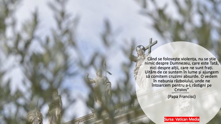 Aceasta pentru că „noi, am uitat drumul care conduce la pace” spune Pontiful, tocmai prin indiferență, lăcomie sau interes personal... O pace pentru care Papa Francisc a făcut apel de fiecare dată, chiar înainte ca acest conflict să escaladeze în apropiata noastră vecinătate: „Să ne rugăm în tăcere pentru pace. Să fie împlinit orice efort în favoarea păcii!” spunea pe 13 februarie a.c. la rugăciunea Îngerul Domnului, din Vatican, îndemnând de nenumărate ori ca „armele să tacă” (27 februarie a.c.), căci „războiul e o nebunie” (19 martie a.c.), invitând la rugăciune oamenii din lumea întreagă ca „să fie oprit războiul, înainte ca acesta să șteargă omul din Istorie”.