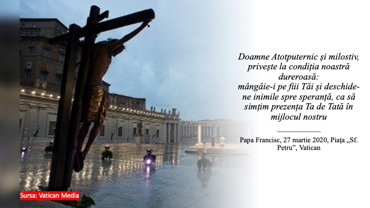 Într-o piață „Sf. Petru” goală, tăcută și ploioasă, pe 27 martie 2020, un om îmbrăcat în alb săruta picioarele Crucifixului marcelin roman, invocând binecuvântarea lui Dumnezeu pentru lumea întreagă „la fel ca ucenicii Evangheliei, am fost prinși cu nerăbdare de o furtună neașteptată și furioasă, provocată de pandemia Covid.