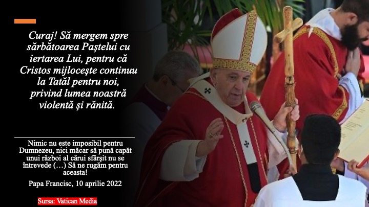 Au fost cuvintele Papei Francisc, care s-a gândind la „mamele care plâng moartea nedreaptă a soților și copiilor lor. El este crucificat în refugiații care fug de bombe cu copiii în brațe. Este răstignit în bătrânii lăsați să moară singuri, în tinerii lipsiți de viitor, în soldații trimiși să-și omoare frații. Cristos este răstignit acolo astăzi” (Omilia din duminica Floriilor 2022, https: //www.vatican.va/ content/francesco/it/homilies/2022/documents/20220410-omelia-palme.html)
