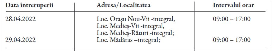 DISTRIBUȚIE ENERGIE ELECTRICĂ ROMANIA S.A. - Sucursala Satu Mare anunţă întreruperea alimentării cu energie electrică: