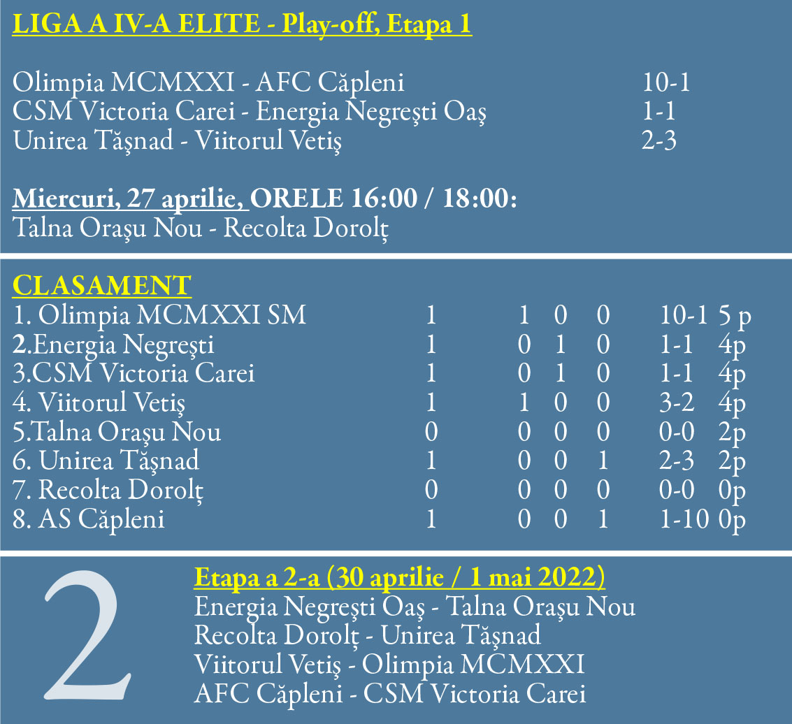 Blăjean CristianOlimpia Satu Mare a deschis vineri după amiază play-off-ul Ligii a 4-a elite. Galben-albaștrii lui Lulu Dragomir și-au făcut încălzirea pentru duelurile cu Negrești și Carei și le-au administrat un... 10-1 celor de la AS Căpleni.