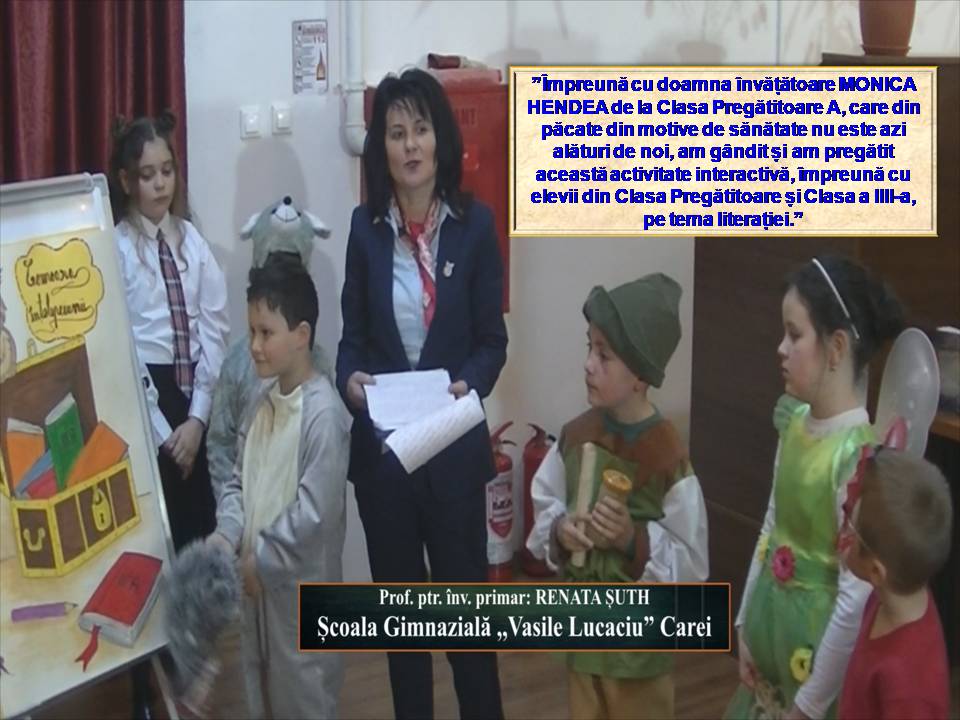 Copiii prezenți și-au arătat bucuria interpretării jocului de rol, au intrat cu plăcere în rolul personajelor, partea interesantă fiind oferită de micuții clasei a III – a A, care și-au arătat imaginația și creativitatea, au inventat și creat povestea ,,Comoara înțelepciunii”, cu personaje ... acțiune, au stabilit desfășurarea evenimentelor, recuzita și mesajul lecturii și au scris povestea cu litere mari de tipar, metoda lingvistică integrală fiind una dintre metodele de învățare a cititului / scrisului în clasa pregătitoare.